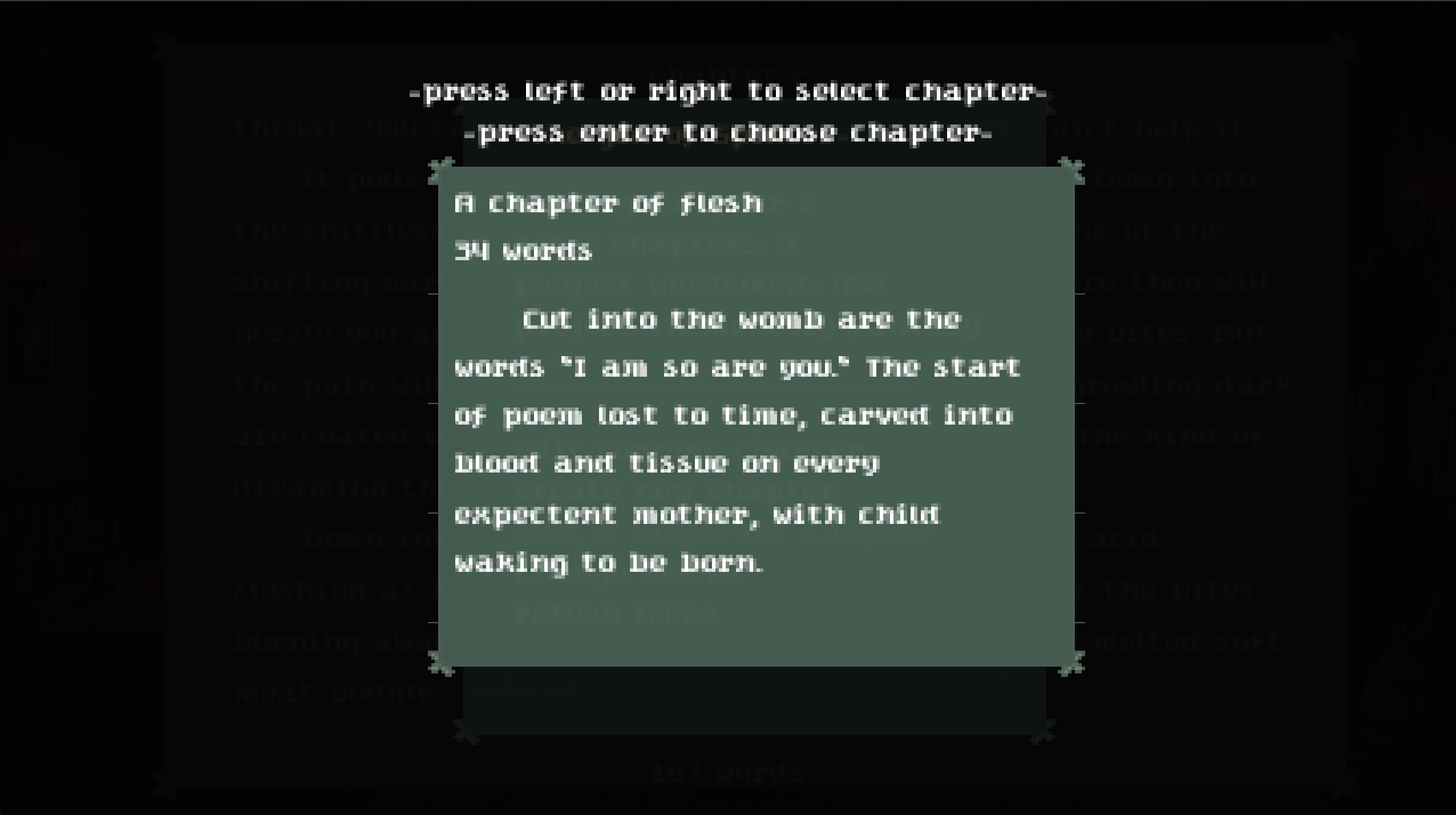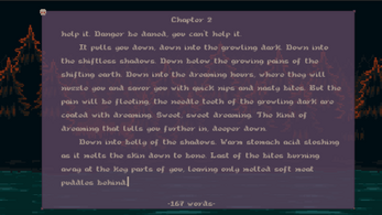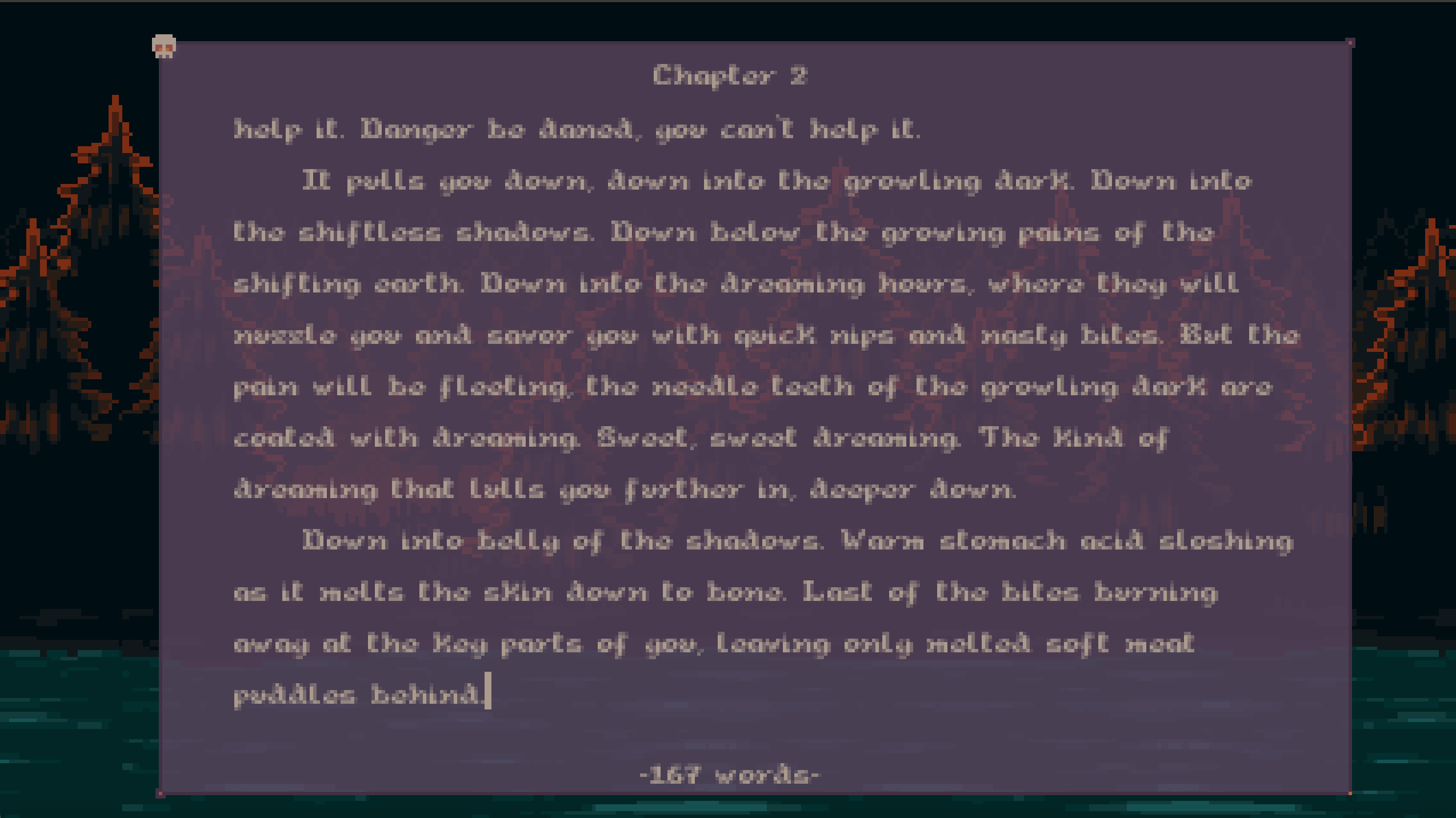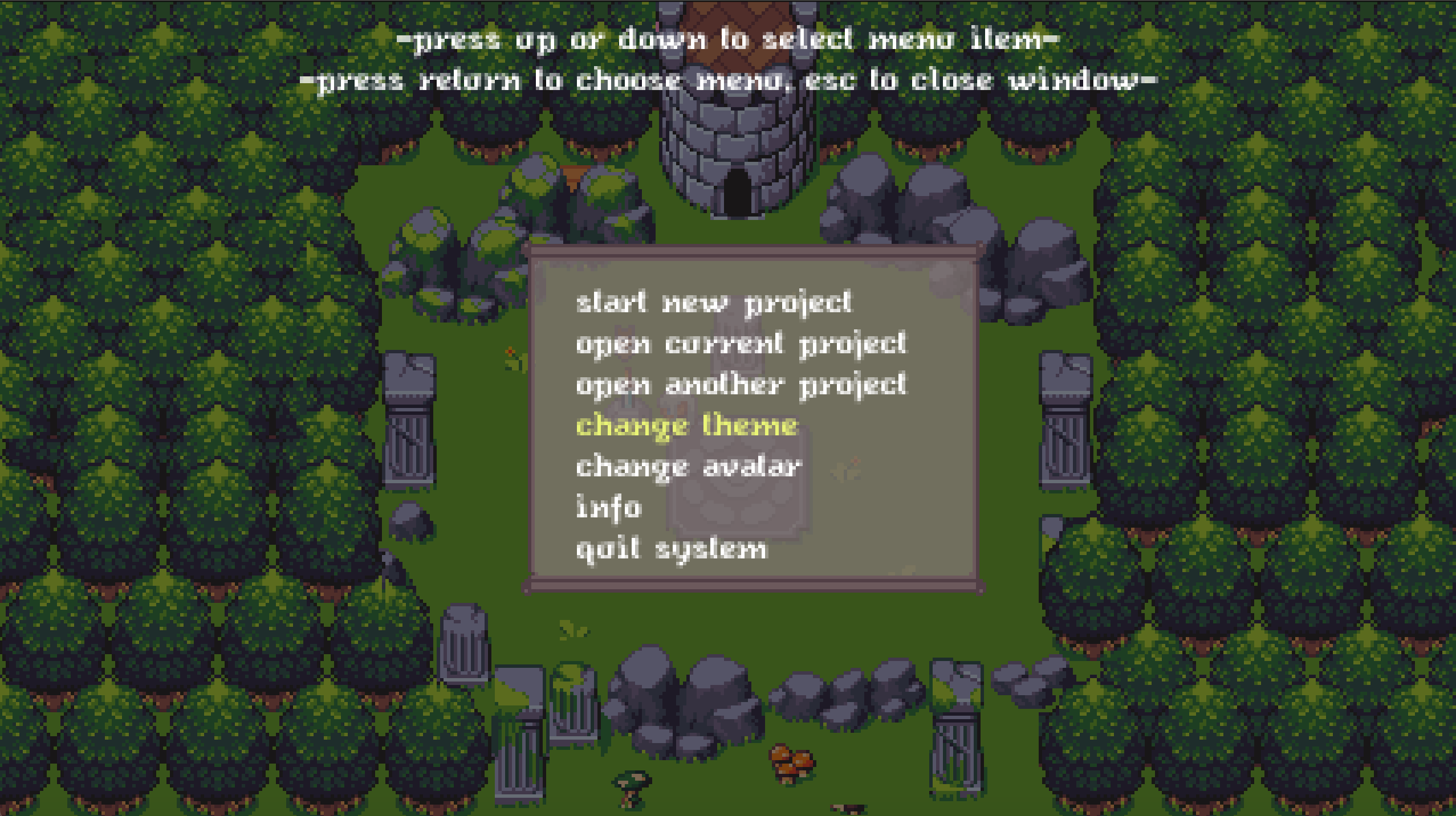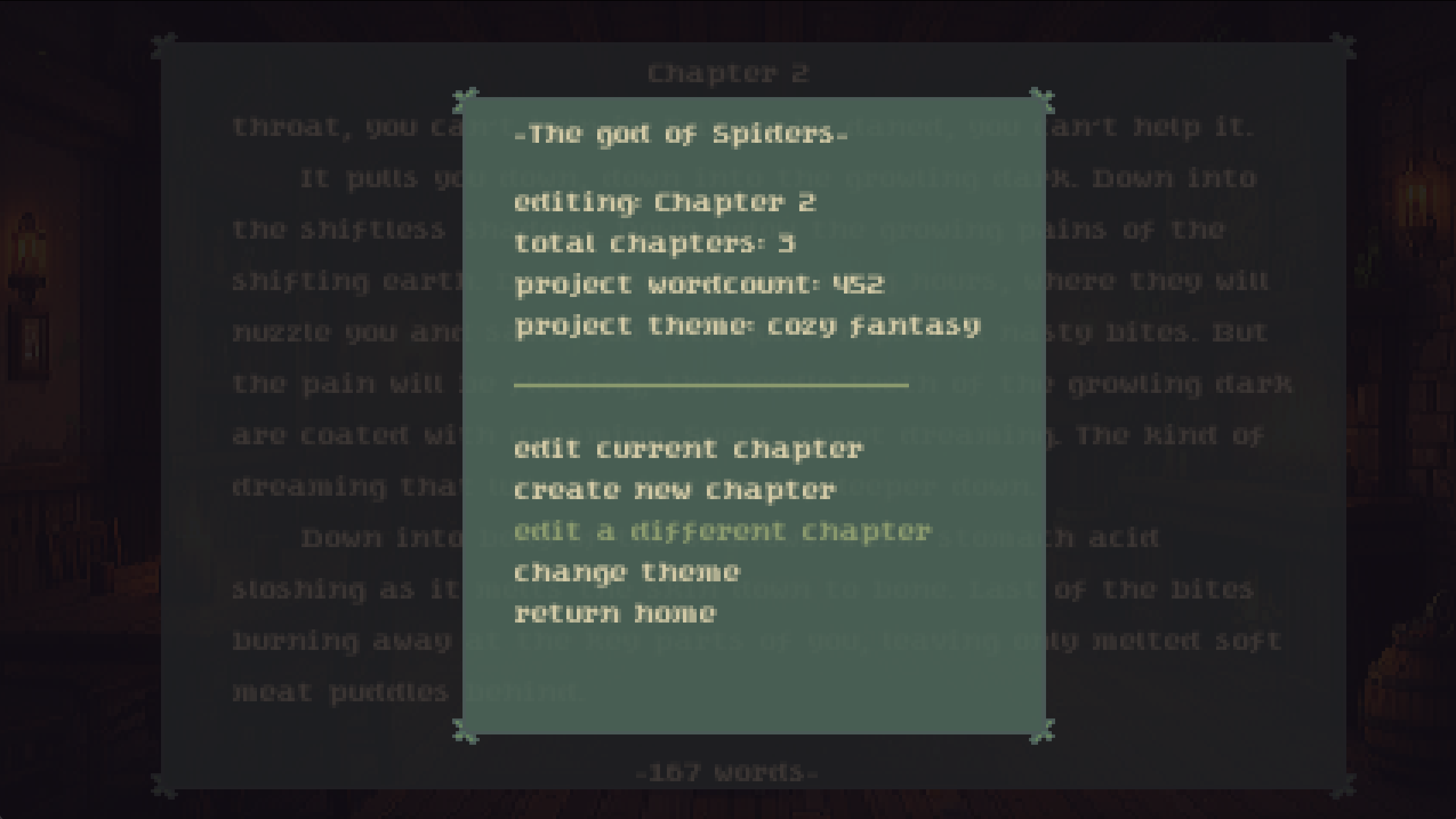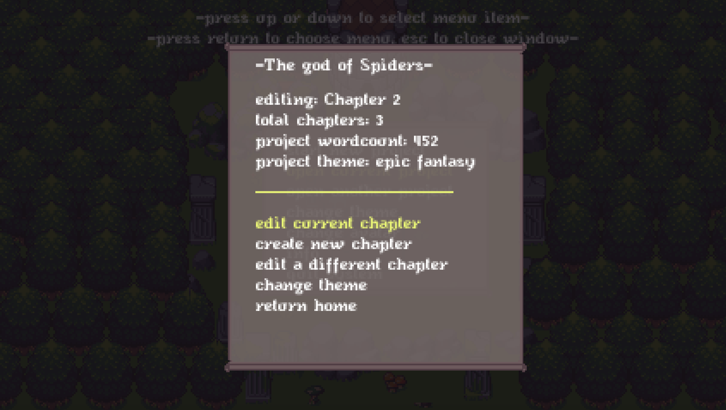 A virtual writerdeck, to help you focus on a firstdraft and just write that novel or shortstory. And done in a way for maximum joy, by looking and playing like an old supernes or gameboy advance RPG.