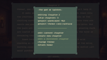 After that, you choose your theme and your avatar. Out of the box it comes with horror, dark fantasy, cozy fantasy, and a default theme. But it's super easy to make your own! And each project can have its own them, to get you in the mood to write and be awesome.